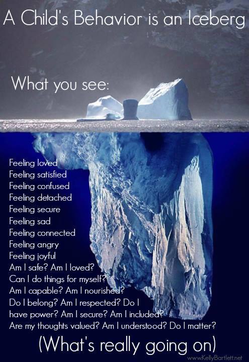 Σαν το παγόβουνο, το μεγαλύτερο και κυριότερο μέρος της συμπεριφοράς, βρίσκεται κάτω από την επιφάνεια, είναι αυτό που ορθώνει το εμφανές μέρος του. Η συμπεριφορά πυροδοτείται από τα συναισθήματα, τα οποία πηγάζουν από τις βαθύτατα ριζωμένες ανάγκες ενός ανθρώπου. Αυτές, δεν είναι ανάγκες του τύπου: χρειάζομαι γλυκό/ θέλω καινούριο παιχνίδι/ θέλω να παίξω ηλεκτρονικά. Οι βασικές ανθρώπινες ανάγκες είναι συναισθήματα και ιδέες όπως η αυτονομία, η ασφάλεια, η εμπιστοσύνη, η εμπάθεια, η κατανόηση, ο επαρκής ύπνος, η τροφή, η αίσθηση του να ανήκεις και να είσαι μέρος ενός συνόλου, η ικανότητα, ο σεβασμός και η αγάπη.
