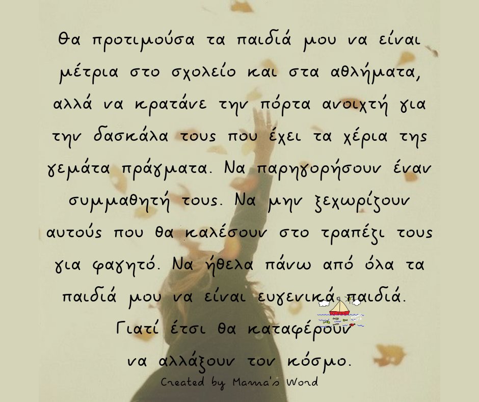 Το μάθημα πρέπει πρώτα να το μάθουμε εμείς καλά και μετά να το μεταφέρουμε στα παιδιά μας. Θα αλλάξουμε αυτόν τον κόσμο ξεκινώντας από τα παιδιά μας σήμερα. Αλλά πρώτα αναγνωρίζοντας τη δική μας ανεπάρκεια, την δική μας αδυναμία να καθοδηγήσουμε.